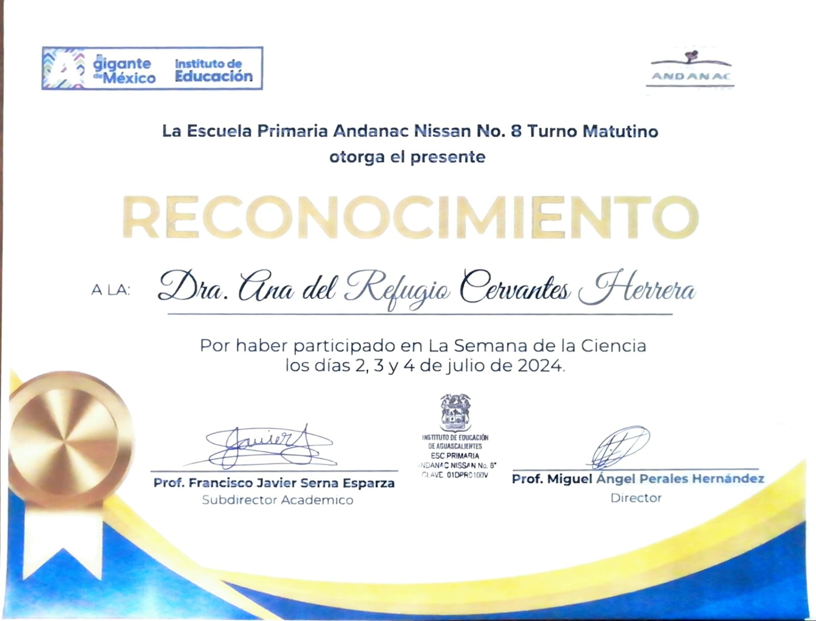 Reconocimiento por participación en La Semana de la Ciencia dirigida a estudiantes de educación primaria, con el objetivo de fomentar el interés científico.